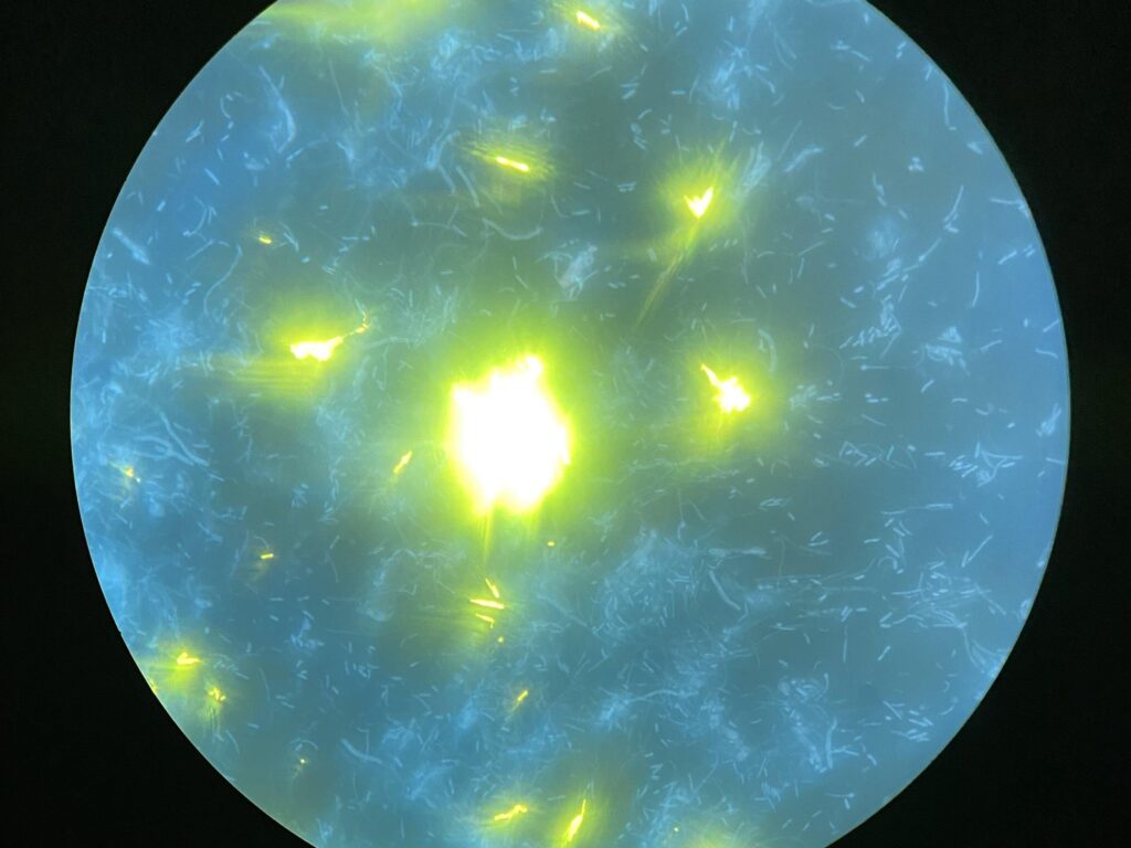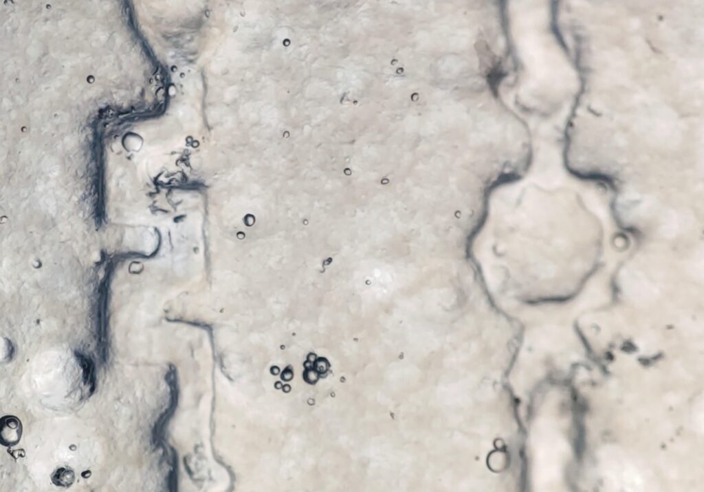 Velvet Echoes of Mullein – The image was taken using a light microscope at 100 magnification. It shows the waxy coating on the surface of mullein leaves.