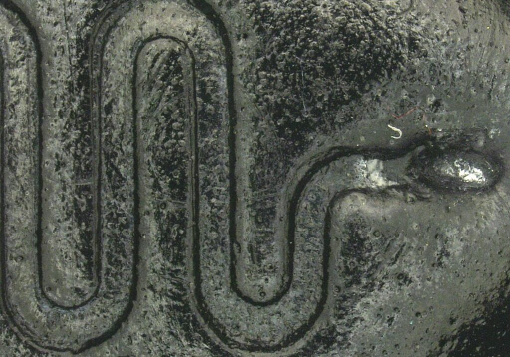 Slytherin – Digital microscope KEYENCE VHX-500FE, 20x magnification. Microscopic image of a flow microchannel (channel width is 1 mm) resembling Salazar Slytherin’s snake created by imprinting a meandering stamp into a hydrogel with CNT as a substrate. Who knows, maybe He will take you to his school.