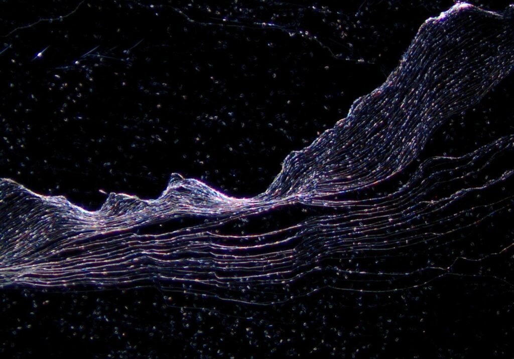 Frozen Waves – Seen through an optical microscope, thin layers of 2D molybdenum trioxide (MoO₃) spread across the surface of highly ordered pyrolytic graphite (HOPG) like a frozen wave. The oxide tends to grow preferentially along the edges of the substrate, giving rise to the striking wave-like patterns.
