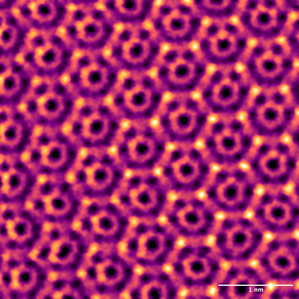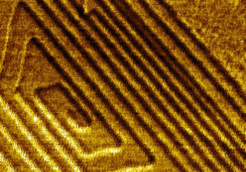 Steps of Cheops – What looks like an ancient pyramid is, in fact, a nanoscale pyramid of 2D molybdenum trioxide (MoO₃). Grown through screw-dislocation-driven processes, the crystal forms regular steps (each step is 0.7 nm thick) that resemble the terraces of a pyramid. Captured with atomic force microscopy in phase mode, the image reveals how nature’s growth mechanisms can create matter at the nanoscale into such remarkable forms. [My personal pick for top 3 – website editor 😉 ]