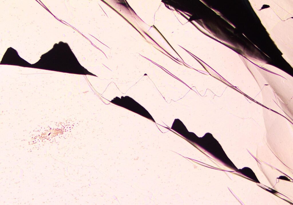 Under the Mountains – Under the optical microscope, folded flakes of highly ordered pyrolytic graphite (HOPG) rise like dark mountains. At their base, two-dimensional crystals of molybdenum trioxide (MoO₃) cluster together, forming what looks like a small village beneath the peaks.