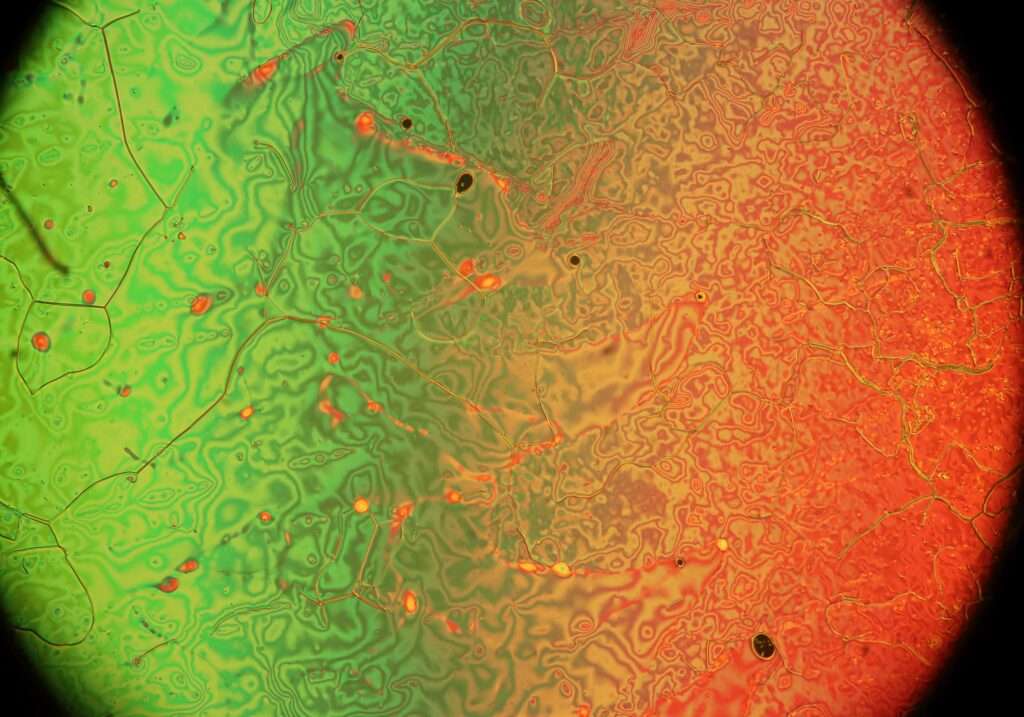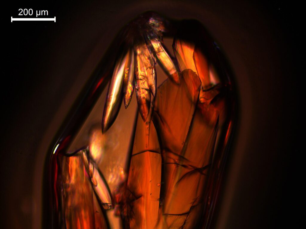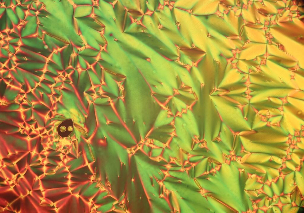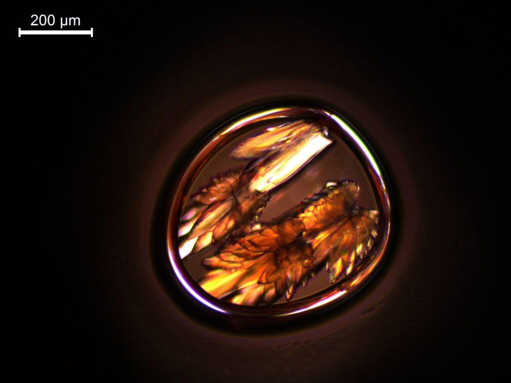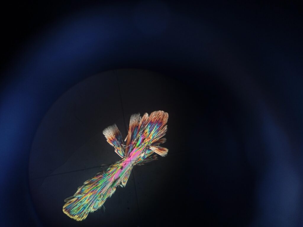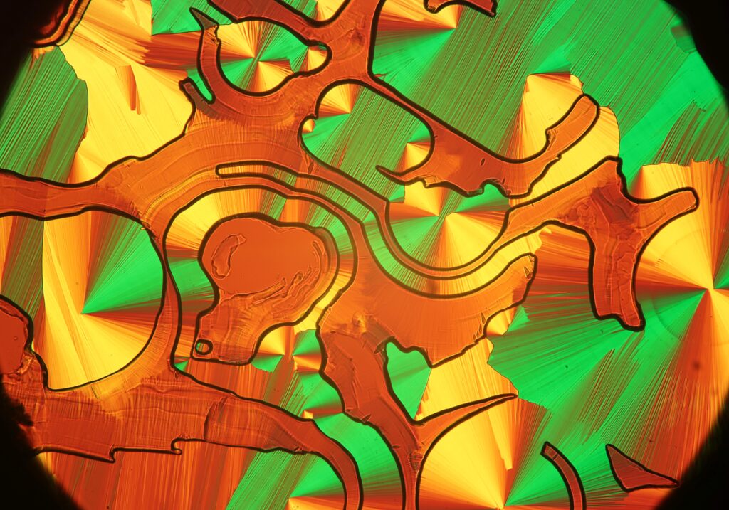Solar Flare – Sample of diethyl 4,4′-azoxydibenzoate liquid crystal. Polarized Light Microscope.