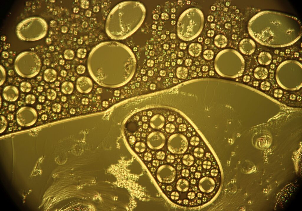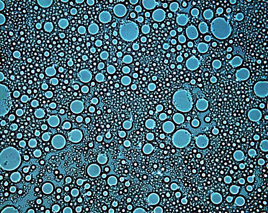 Spheres – The Image shows fat globules distributed in dairy emulsion. It was captured using light microscope.