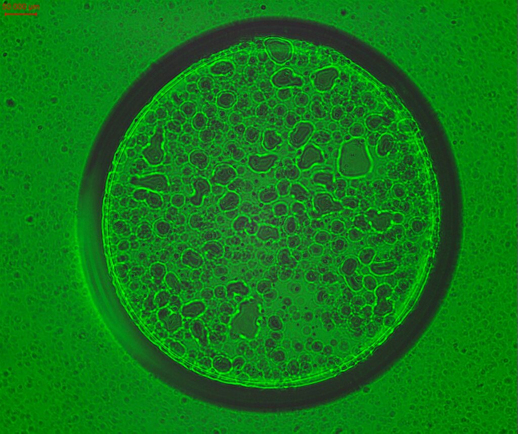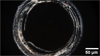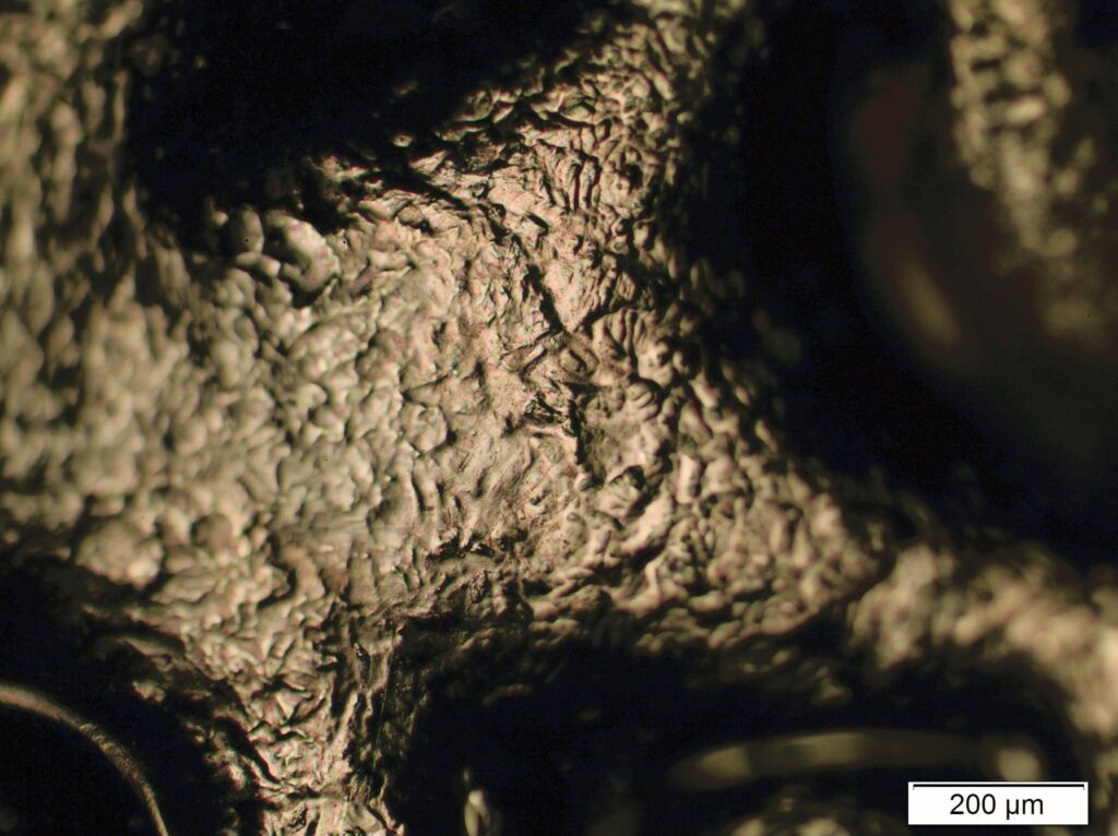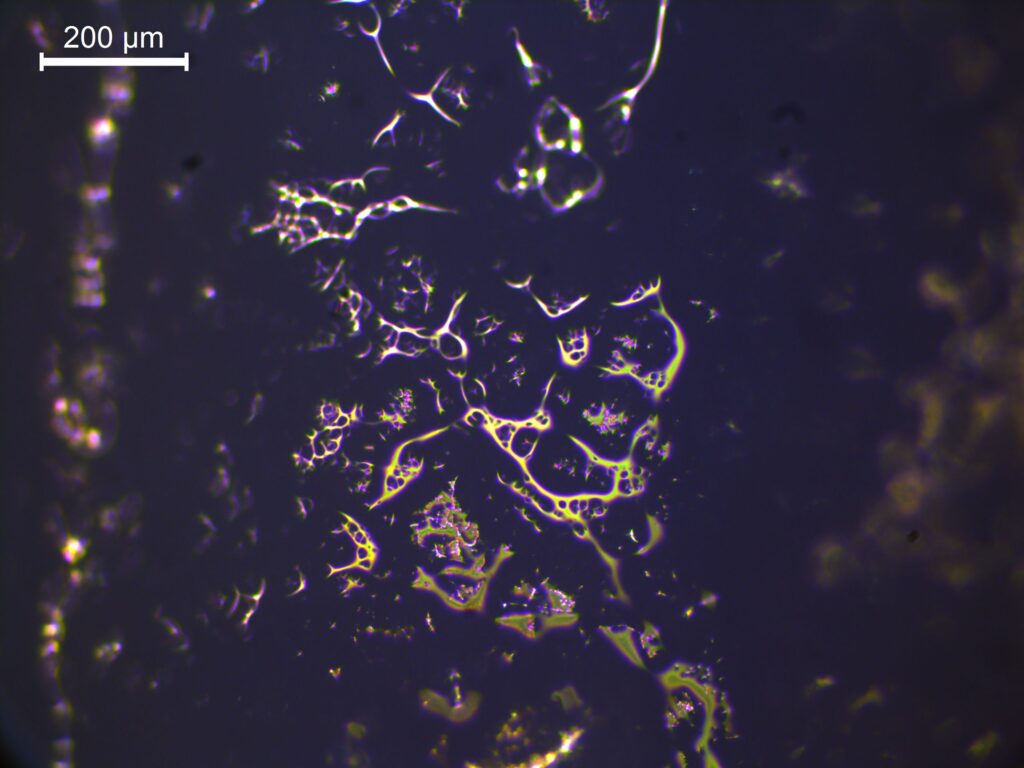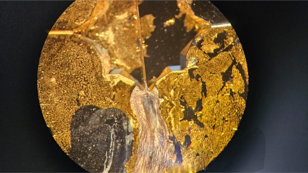 Golden Craters – The image shows an optical fibre attached with silver paste, underneath which there is an etched microchamber. The entire structure is coated with gold, but due to degradation, delamination of the gold is visible. The photo was taken with a PZO MST-132 stereoscopic microscope at 1.6× magnification.