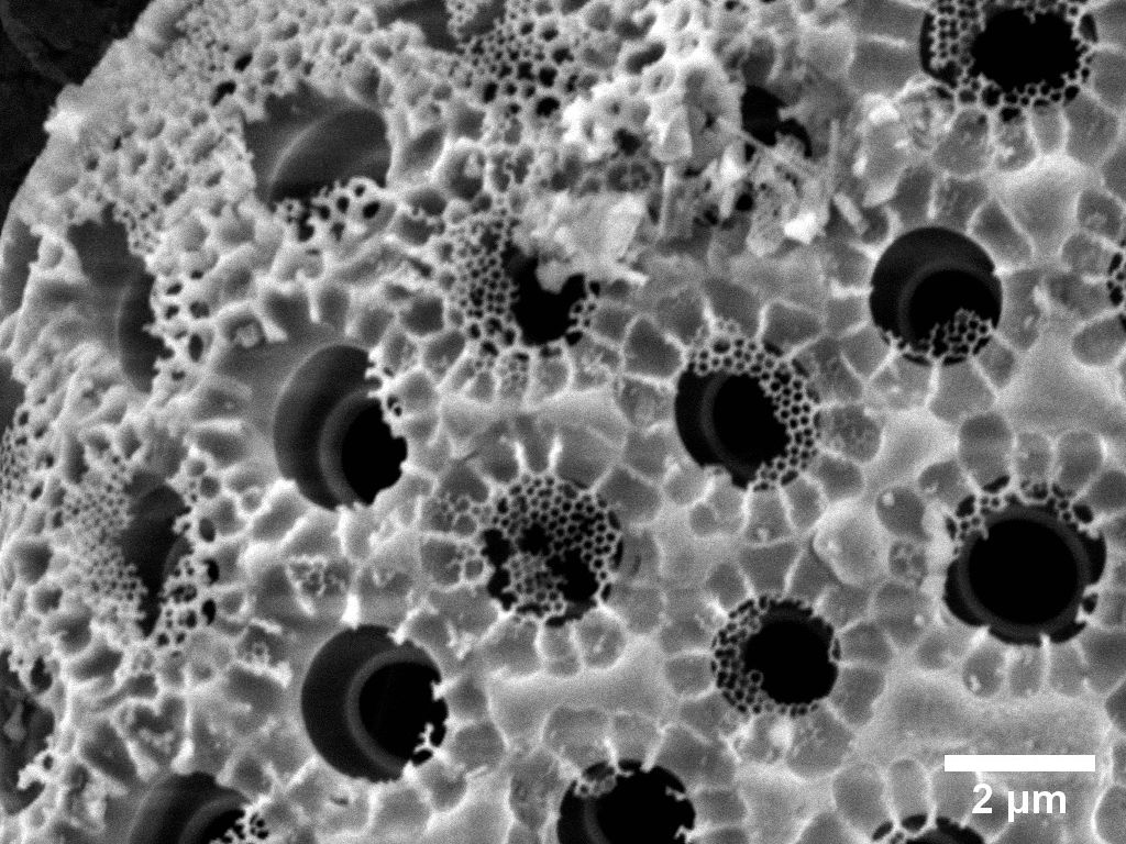 Pompeii – The scanning electron microscopy image, which has been colorized, shows the top surface of undeveloped titania nanotubes formed by anodization of a Ti foil.
