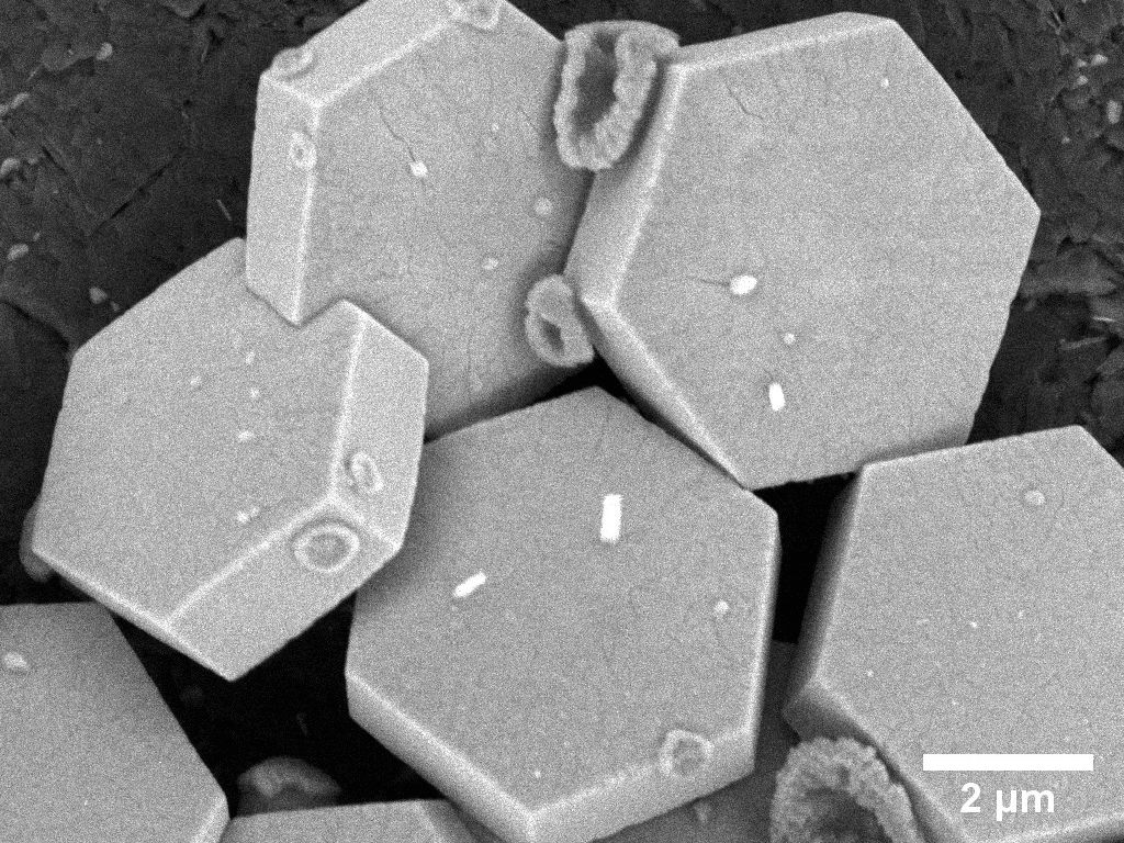 NaYF4 hexagonal crystals – The SEM image shows hexagonal NaYF4 crystals. NaYF₄ (sodium yttrium fluoride) is often used as a host material in luminescent and laser materials. It is characterized by low optical loss and chemical stability, which makes it an ideal host for rare earth (RE) ions.