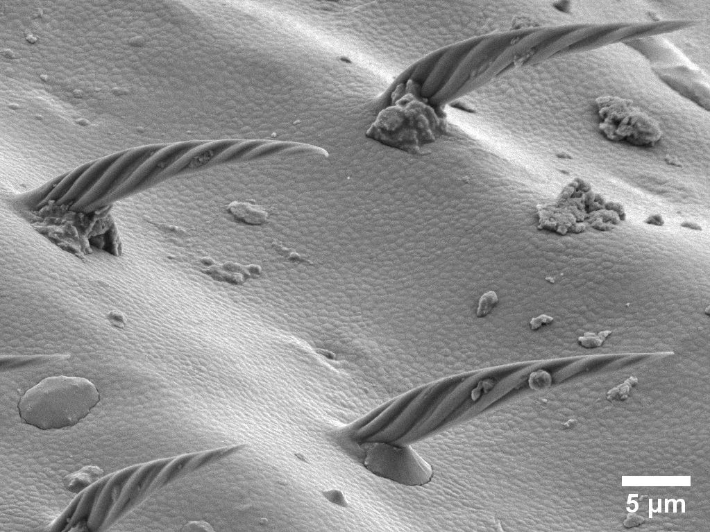 Surface of a wasp’s wing – The SEM image shows the surface of the wing of a common wasp (Vespula vulgaris) with visible sensory hairs (called setae). These types of sensors function as microscopic detectors that detect air movement and touch, and assist in precise flight control.