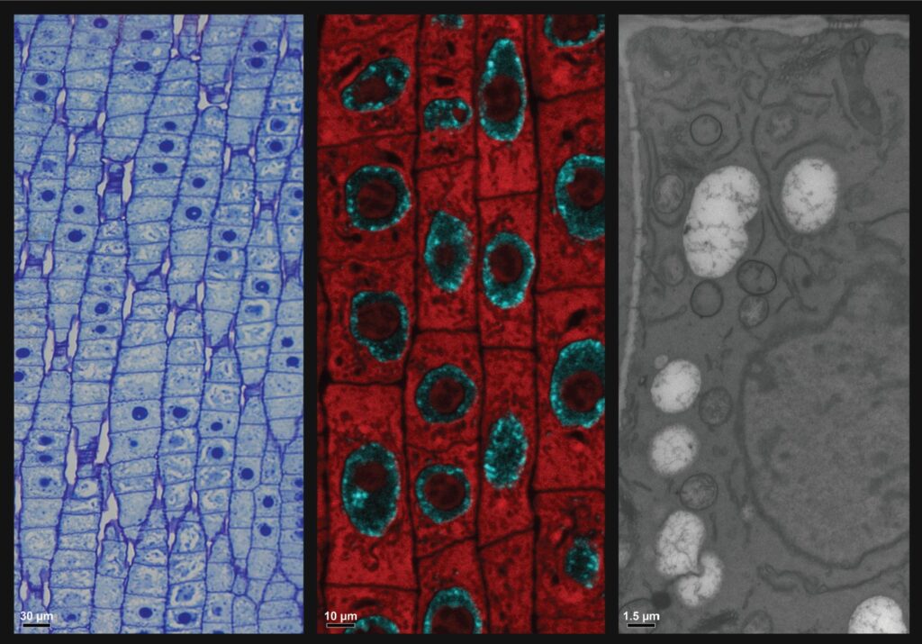 Deeper – Root of narrow-leaved lupine imaged with three microscopes: light (methylene blue), confocal (polyA RNA – red, HOECHST – blue), and electron (lead citrate, uranyl acetate).