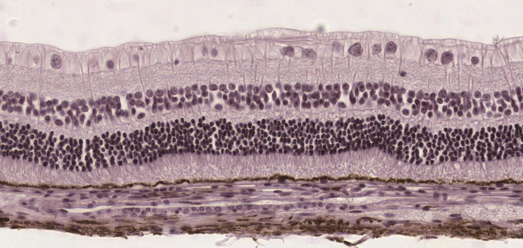 Where Gold Comes Alive in Vision – Pannoramic MIDI II – an automatic digital slide scanner; 40x H&E; The human retina is a marvel of biological engineering, made up of ten intricate layers that an each single photon of light must navigate before we can see the world around us. Each layer, composed of specialized nerve cells, relays the signal, passing it forward like a neural relay race—ultimately sending the final message to the brain via the optic nerve.