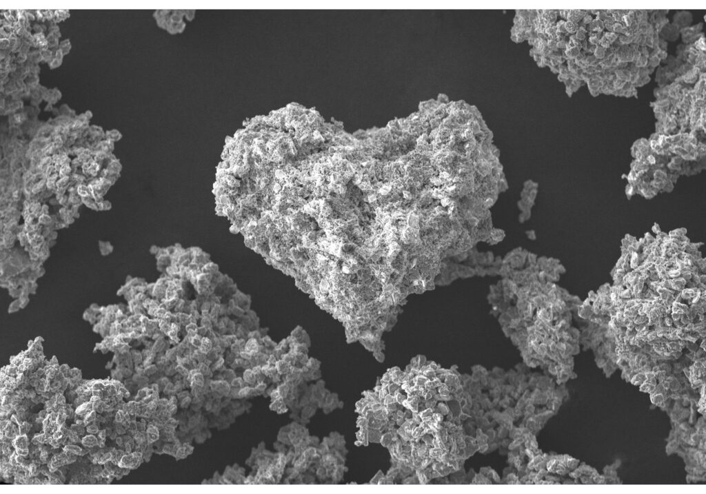 A heartfelt heart amidst the bustling crowd – The solid oxygen carriers contain iron and manganese oxides for chemical looping fuel combustion applications. The photo was made with the SEM JSM-6610 LV microscope by JEOL.