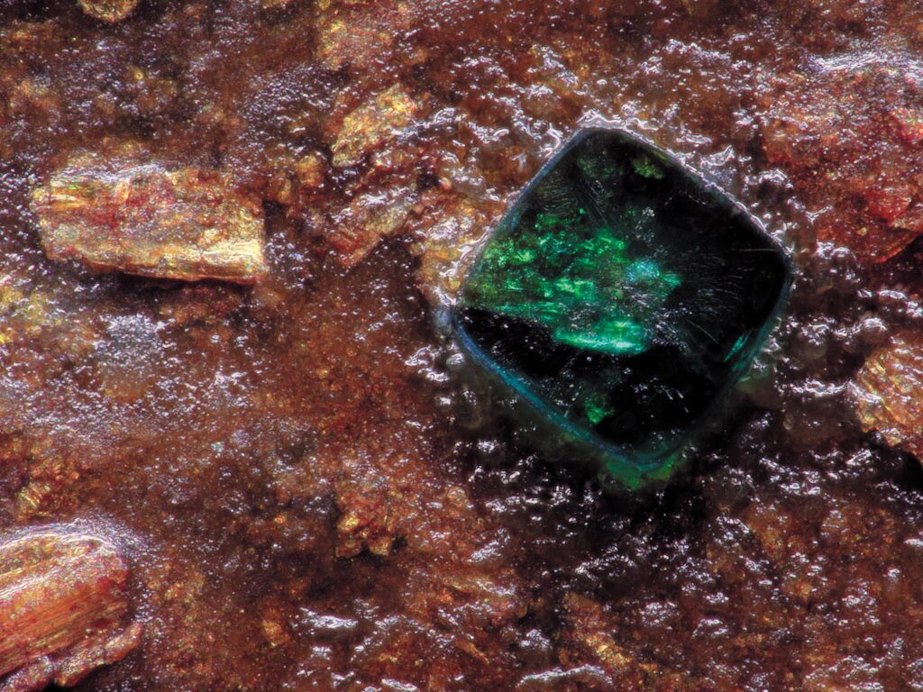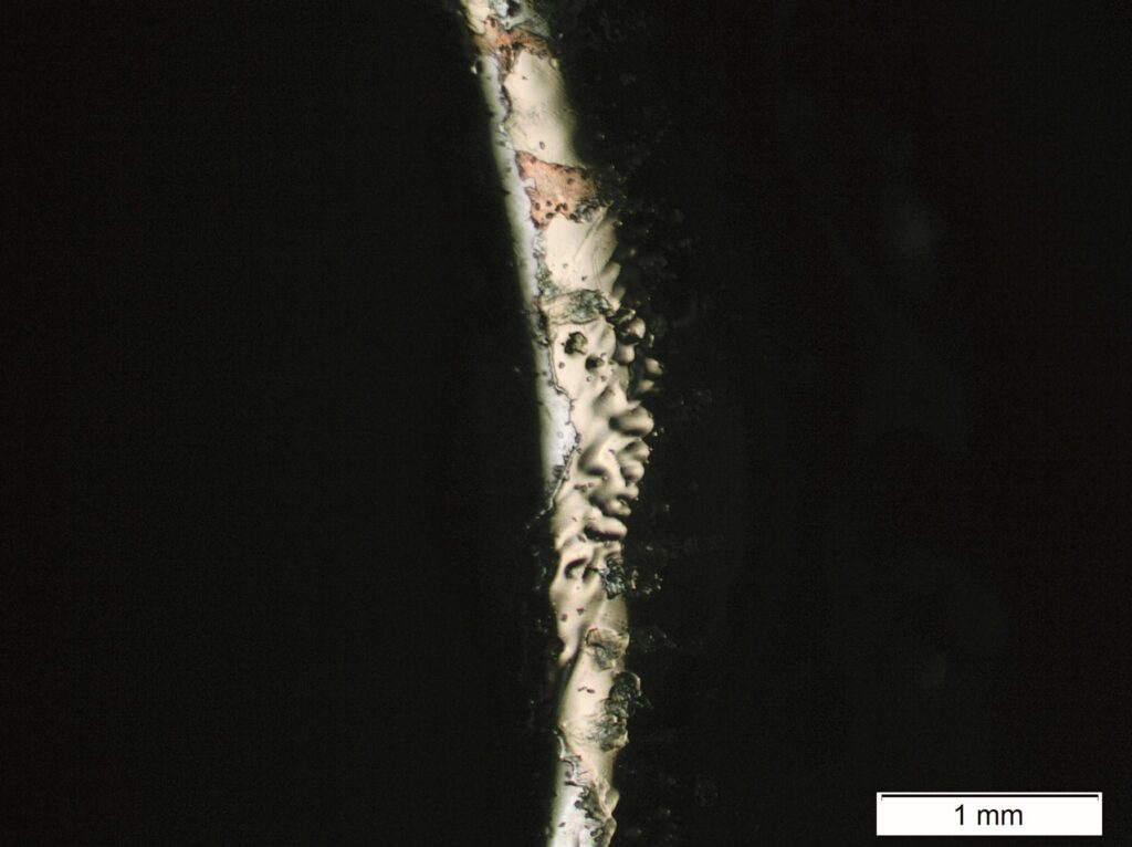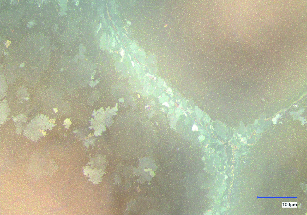 EMERALD – KEYENCE VHX-7000NA copper plate and orpiment (As₂S₃) after undergoing ageing tests in fluctuating temperature and humidity conditions, they revealed true mesmerisingly green treasure.