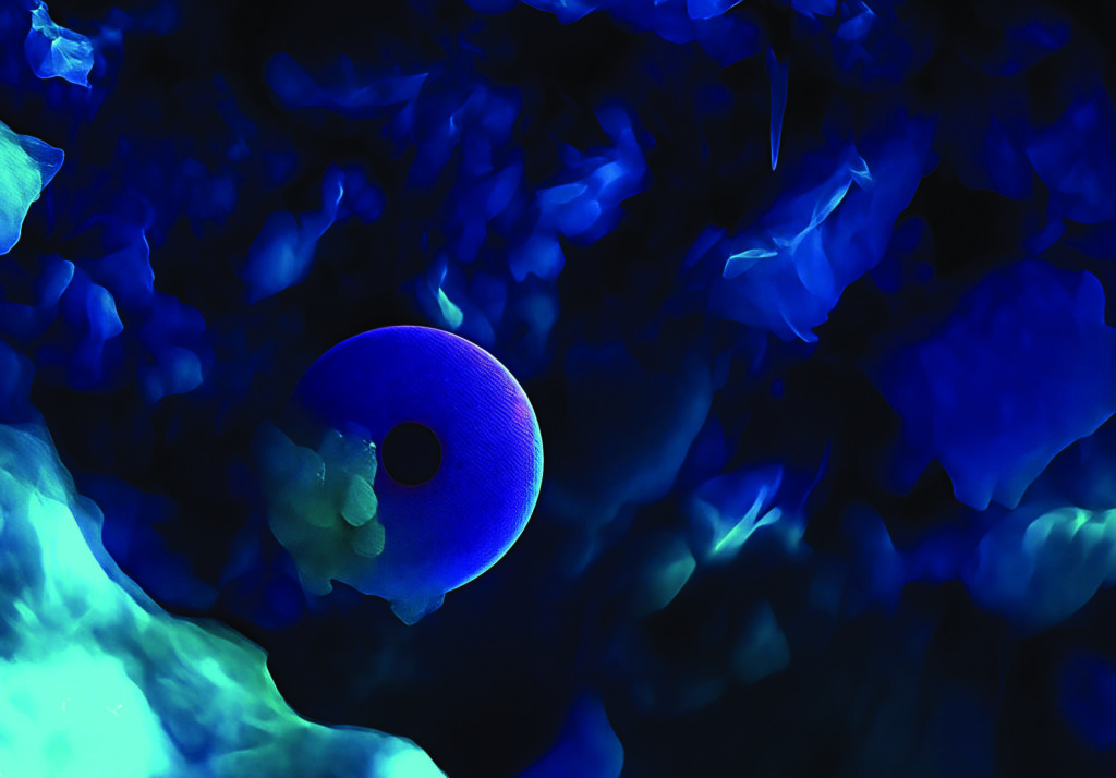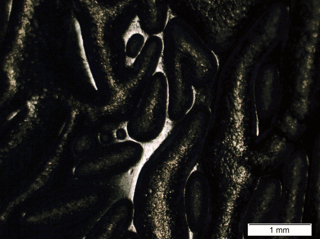 Reminiscence in metal – The photo was taken using optical metallographic microscope and shows unconventional forms resulting from decorative engraving of jewelry. The golden colour emphasises a nostalgic character, reinforcing the theme of “Reminiscence in metal”.