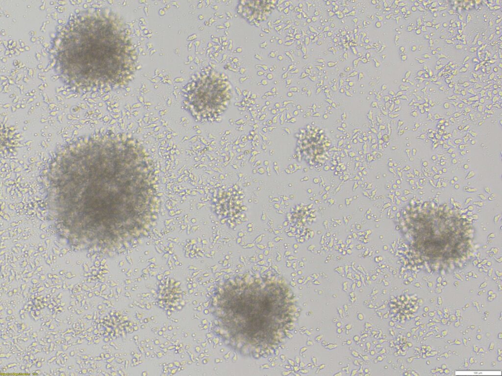 Better Together- This image shows a CAR-T cell culture. Large cell aggregates are visible, and their presence, along with the cells elongated shape, indicates their activation. Microscope- Olympus CKX53.