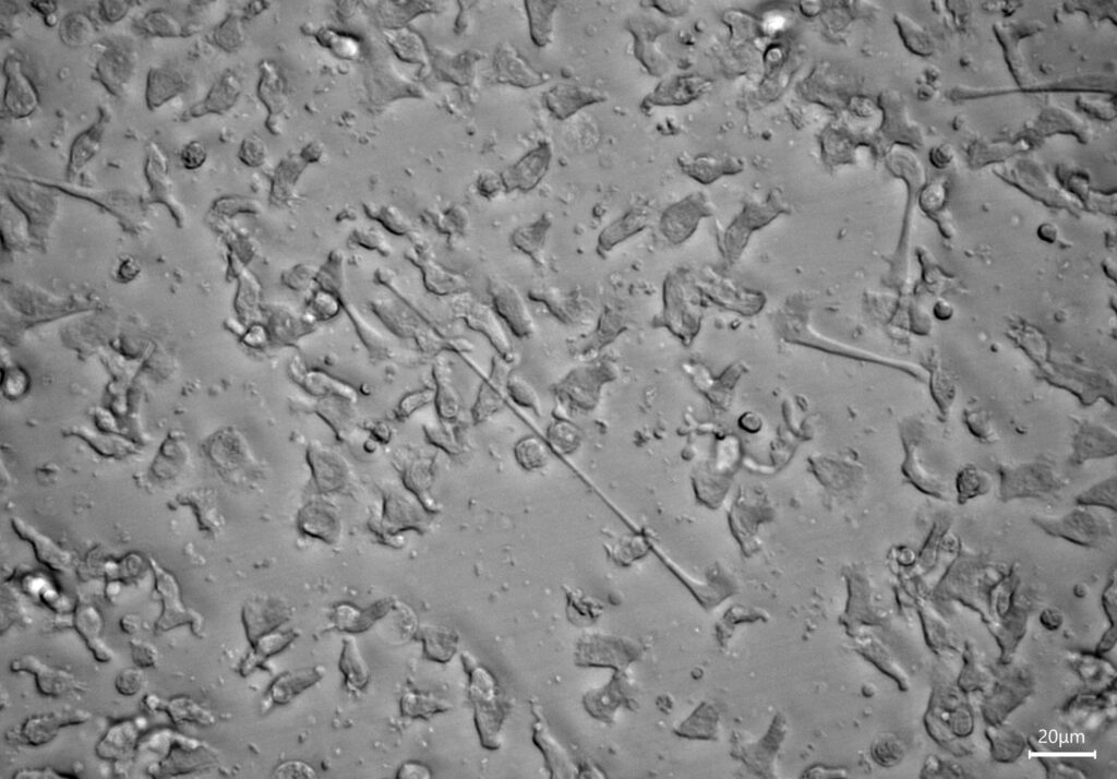 In need of contact- This image shows a culture of NK cells. Elongated cells are visible, likely indicating an activated cell seeking interaction.Microscope- Leica Mateo FL.