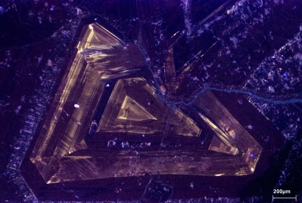 A triangle within a triangle – Image taken from a thin section of quartz under optical cathodoluminescence. The image clearly shows crystal regeneration, dislocations, and chemical variability within the quartz. [My personal pick for top 3 – website editor 😉 ]