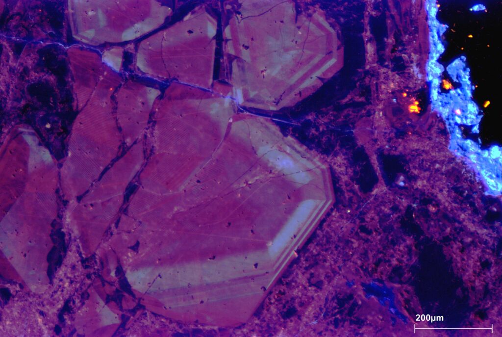 Fingerprinted stone – Image taken from a thin section of a metamorphic rock under optical cathodoluminescence. The micro-zoning of quartz is clearly visible in the image.