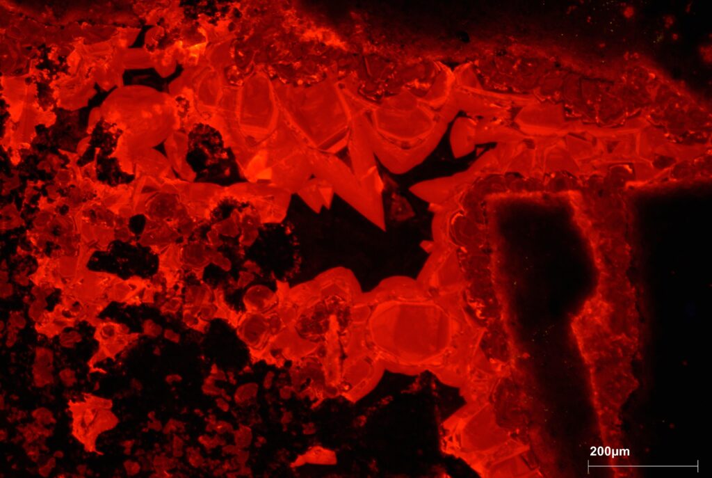 Orange teeth – Image taken from a thin section of a metamorphic rock under optical cathodoluminescence. The orange-colored crystals are calcite.