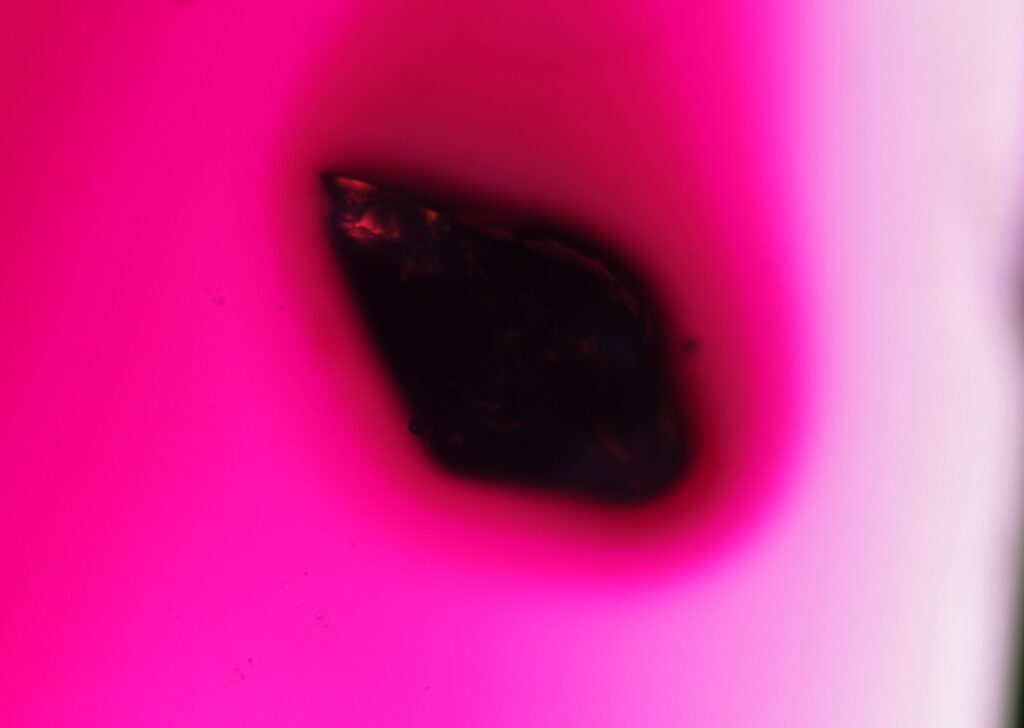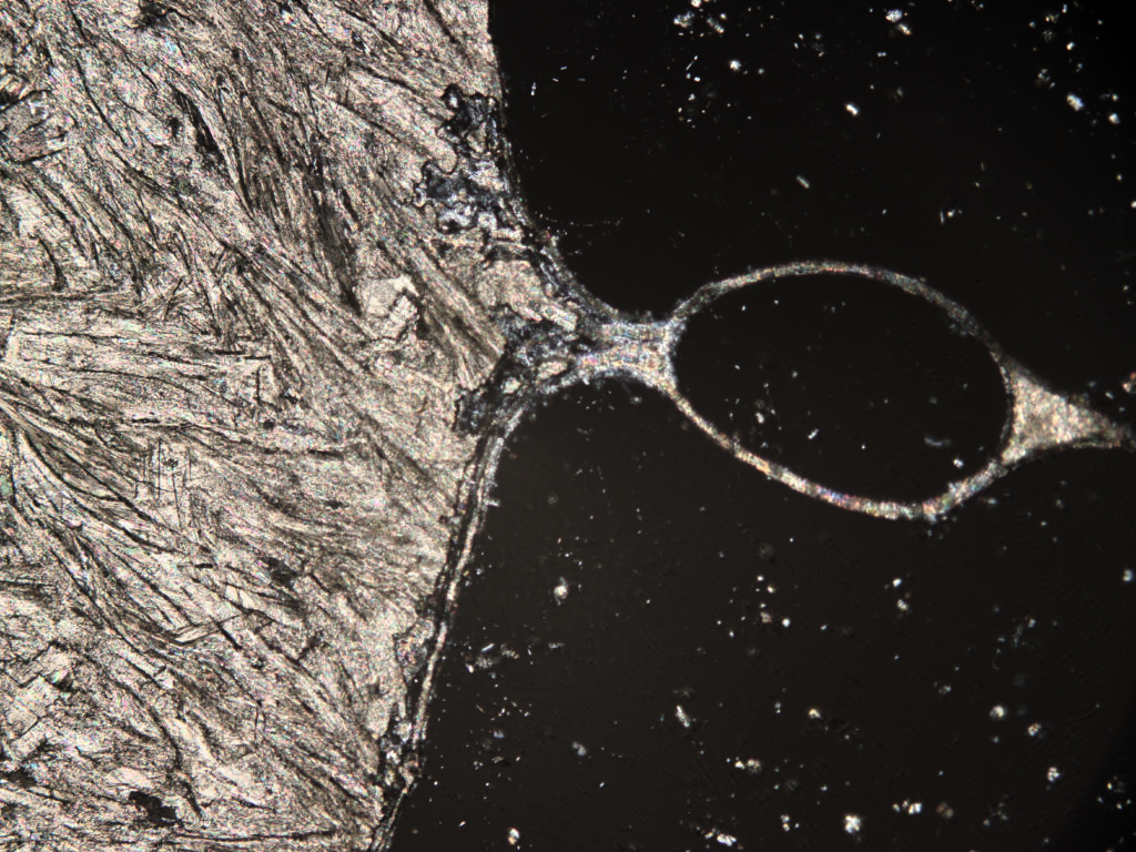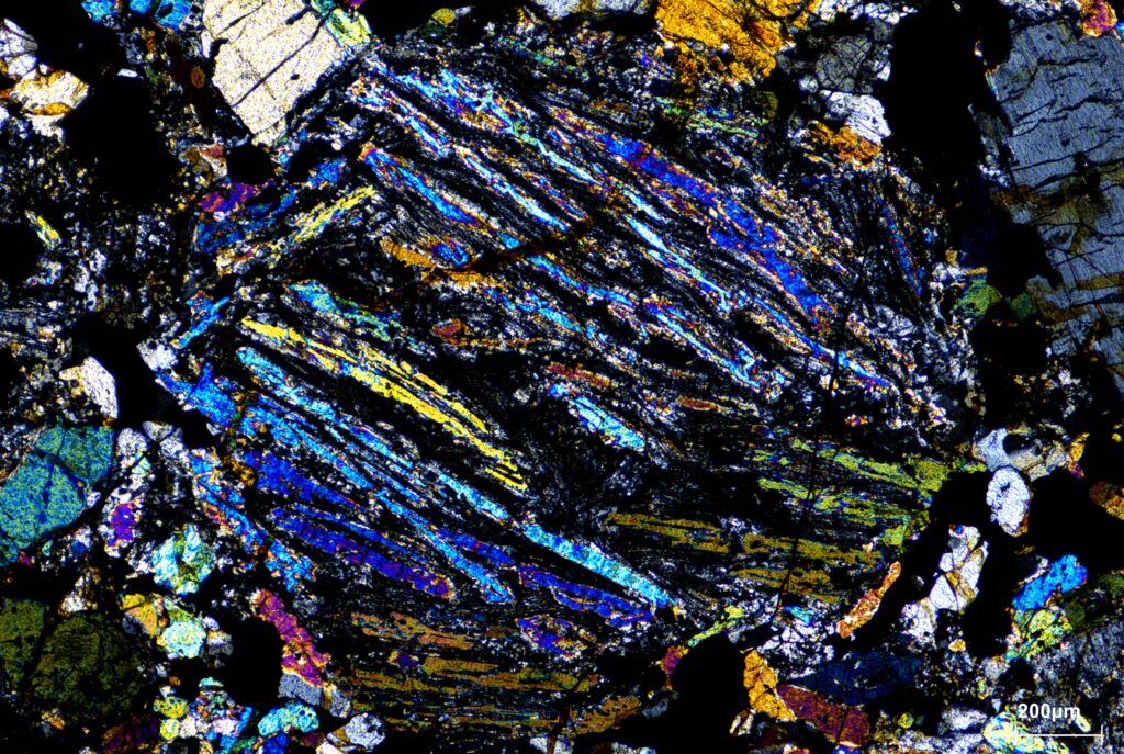 Space ball – Image taken from a thin section of a metamorphic rock under transmitted polarized light with crossed nicols. The photo shows a pyroxene chondrule from the Mt. Tazarzait meteorite.