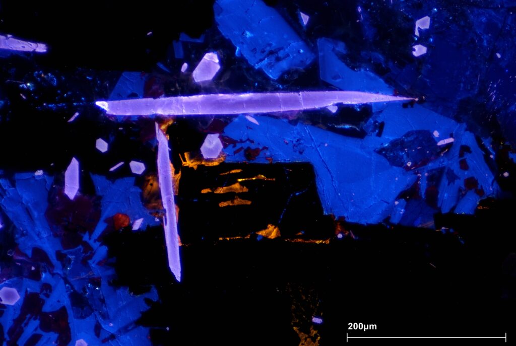 Star ships – Image taken from a thin section of an igneous rock (cieszynite) under optical cathodoluminescence. The purple crystals are apatite, the blue ones are feldspars, and the orange ones are calcite.