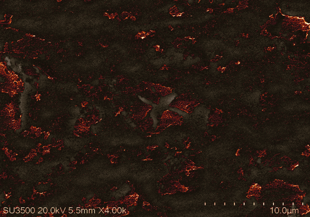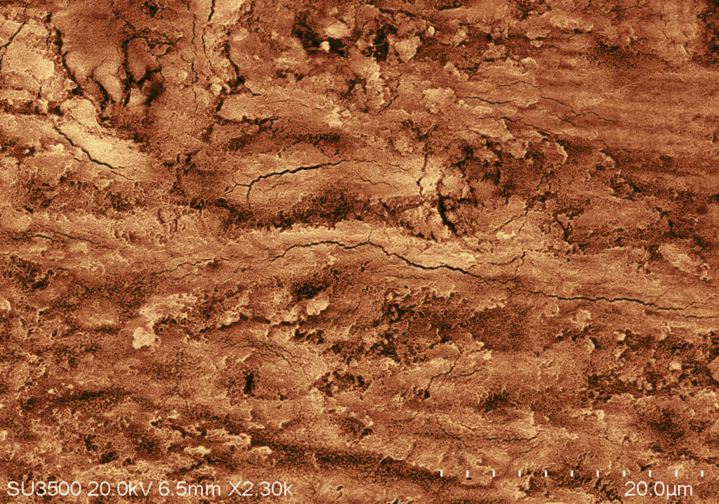 Elephant’s skin – ZEISS EVO MA25 scanning electron microscope. 3D printed alginate/chitosan hydrogel scaffold, coated in pectin, dried.