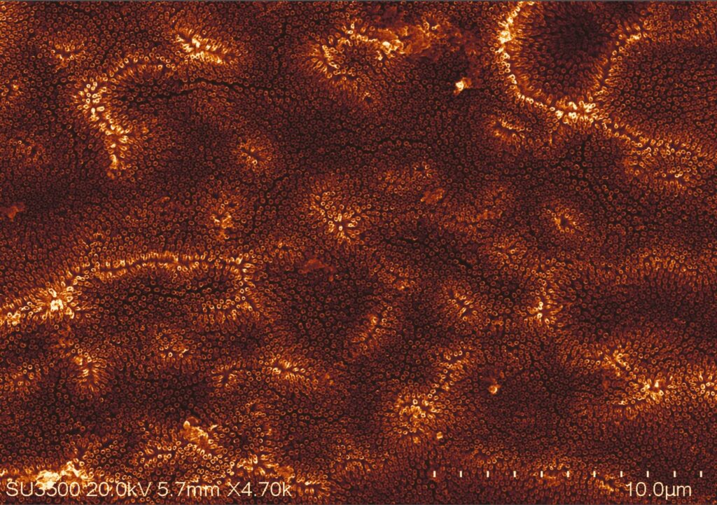 Desert – The scanning electron microscopy image, which has been colorized, shows the top surface of undeveloped titania nanotubes formed by anodization of Ti foil.