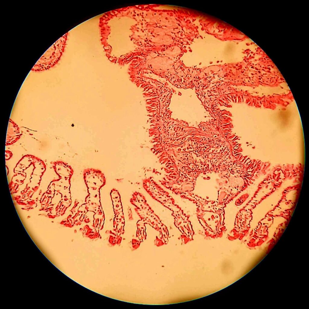 Ciliary Ballet of Cells – The image was obtained using a light microscope at 100 magnification, showing ciliated epithelial cells.