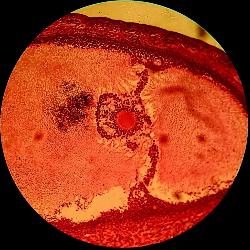The Cat’s Hidden Orbit – Captured under a light microscope at 100 magnification, this image reveals a Graafian follicle in a cat’s ovary.