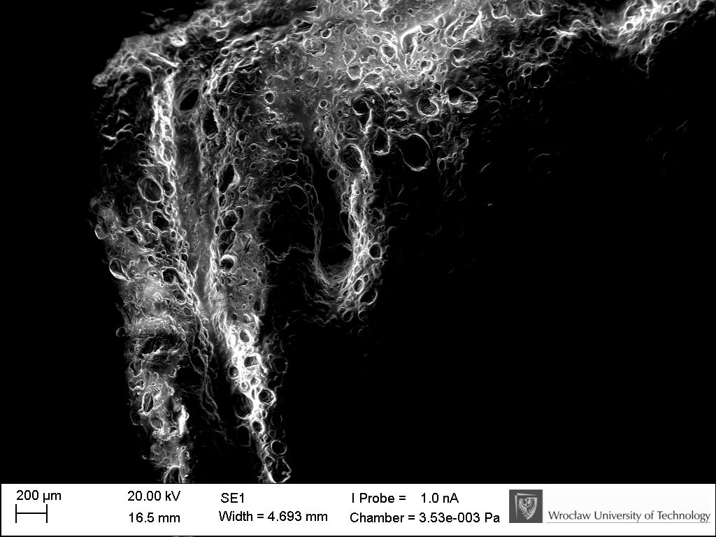 Eyjafjallajökull’s eruption – ZEISS EVO MA25 scanning electron microscope. 3D printed alginate/chitosan hydrogel scaffold, dried.