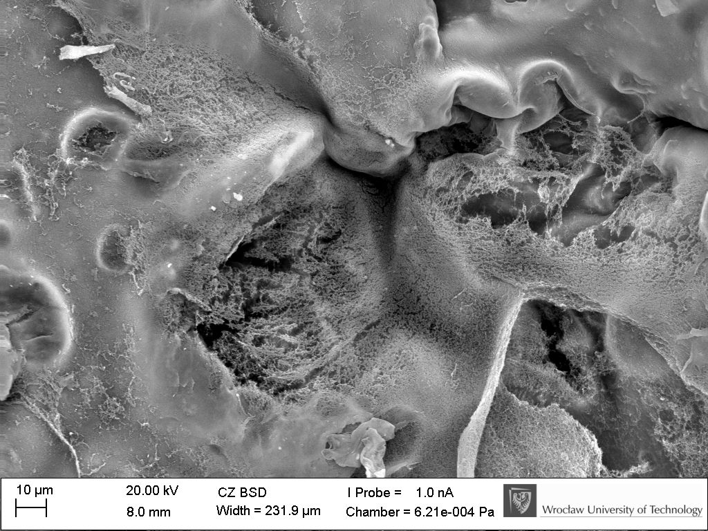 Mycelium attack – ZEISS EVO MA25 scanning electron microscope. 3D printed alginate/chitosan hydrogel scaffold, coated in pectin, dried.