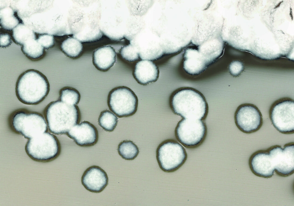 Cotton Clouds – Colonies of Pseudonocardia autotrophica PCM 2186 growing on a medium plate. Photo taken on VHX-X1 digital microscope in reflected light mode with depth composition.