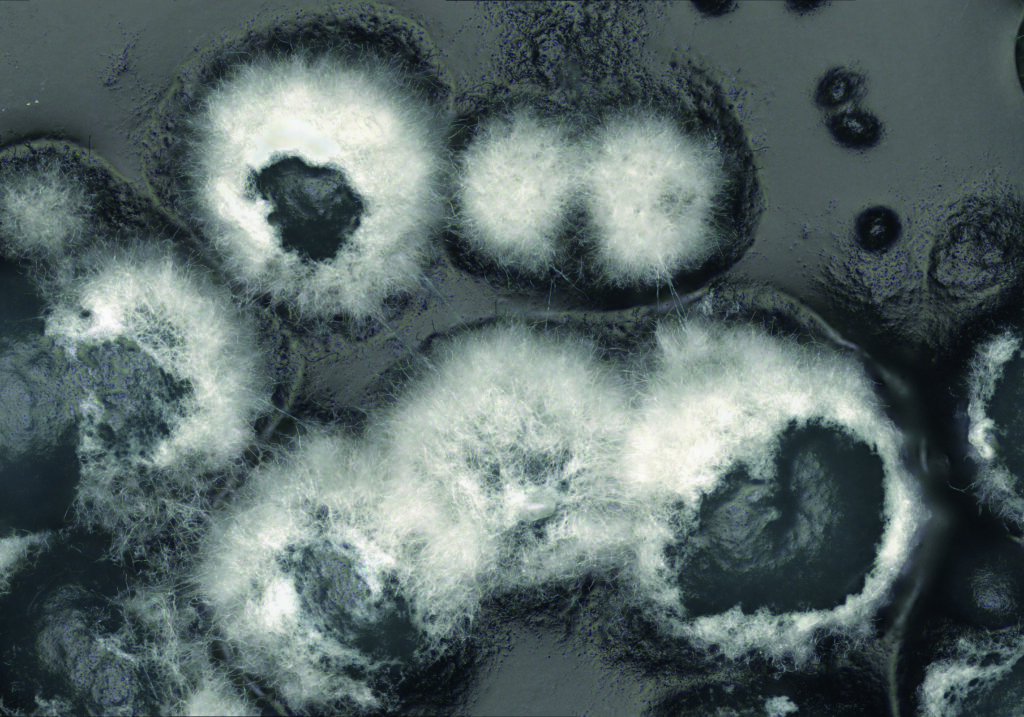 Holding Together – Colonies of Streptomyces griseus PCM 2331 growing on medium plate under VHX-X1 digital microscope in reflected light with depth composition.