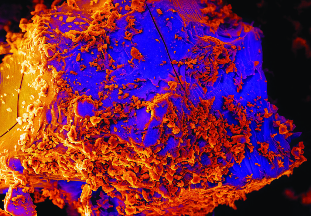 Blue Donut – – SEM/HITACHI S-3400N/2007 Electronic Scanning Microscope, a picture of a sample of the soil, used for morphological measurement at the SPEED Project (10.0kV, 9.8mm, x6000 zoom). [Holy cow! My personal pick for top 3 – website editor 😉 ]