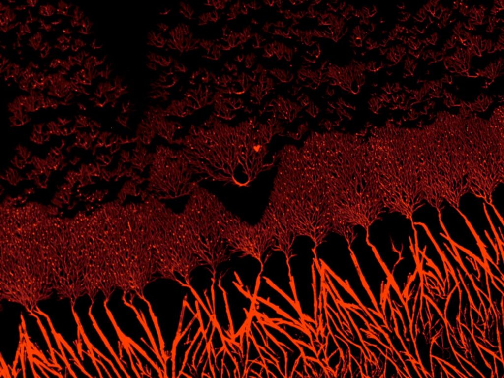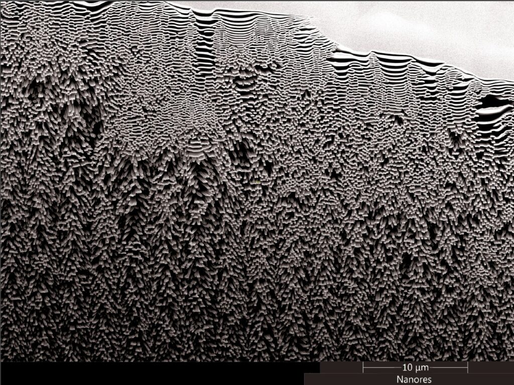 Forest in Nanoscale – Under the eye of the scanning electron microscope (SEM), a fascinating phenomenon reveals itself: when gold or platinum is sputtered onto a non-conductive material to improve its conductivity, a sufficient tilt can set atoms adrift, carried by ions, thus sculpting a surprising structure. Image taken in the company Nanores. [My personal pick for top 3 – website editor 😉 ]