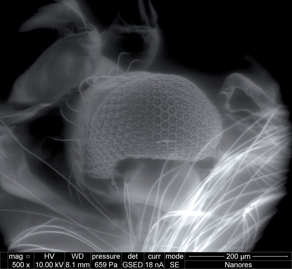 Scoundrel – In this image, you see the intricate compound eye of a mosquito, framed by its delicate antennae. Using an environmental scanning electron microscope, which allows biological samples to be imaged without the destructive effects of high vacuum by maintaining a fine balance of water vapor, we could explore the insect in extraordinary detail. The story began when a colleague was bitten at work; in playful revenge, we captured the mosquito, kept it alive in a container until it passed naturally, and then placed it under the microscope. We hoped to find traces of blood inside its proboscis, the specialized needle-like mouthpart used to pierce skin, but by then the cells had already been digested. However, I must admit that its eyes seem to show remorse.