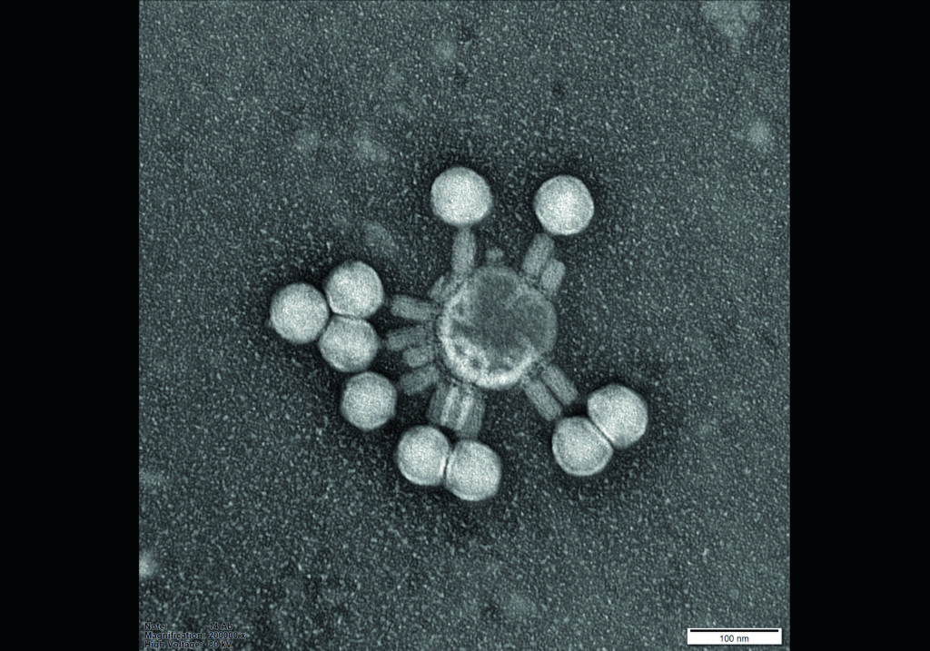 PhagePlosion – An electronogram made in transmission electron microscope probably showing bacteriophages (phages) attached do outer membrane vesicle (OMV). OMV are fragments of the outer membrane of bacteria, that can act as a decoy and protect pathogen from phage infection, preventing their adsorption to bacterial cell. Co-author MSc Norbert Łodej