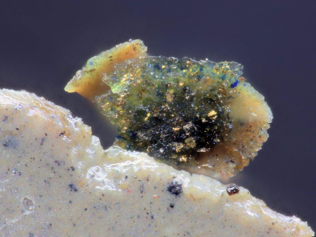 RYBCIA “Little Fish” – KEYENCE VHX-7000N A sample of a paint layer taken from a historic painting looks as colourful as an underwater coral reef. The image shows a fragment with remnants of gilding and a striking blue “eye” made from the most precious pigment in the world: lapis lazuli.