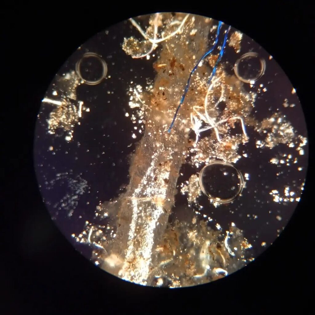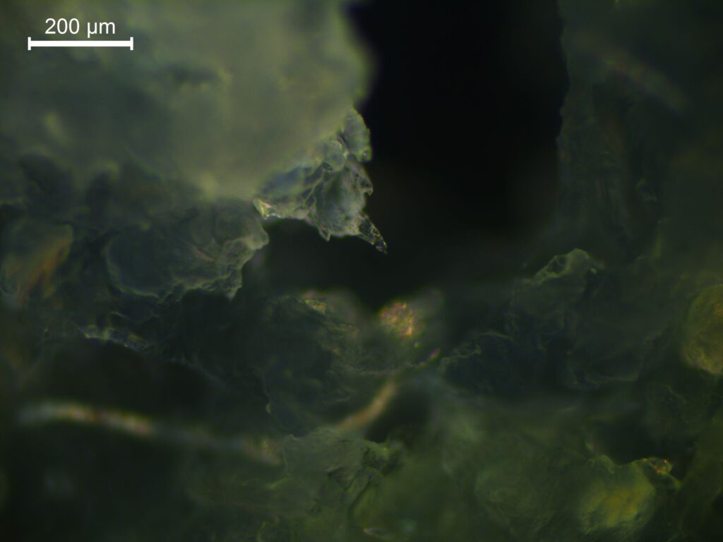 Roots of Light – Root of water plant from Sołtysowicki Forest, with visible polymer fiber. Bright field microscope with polarization filter.