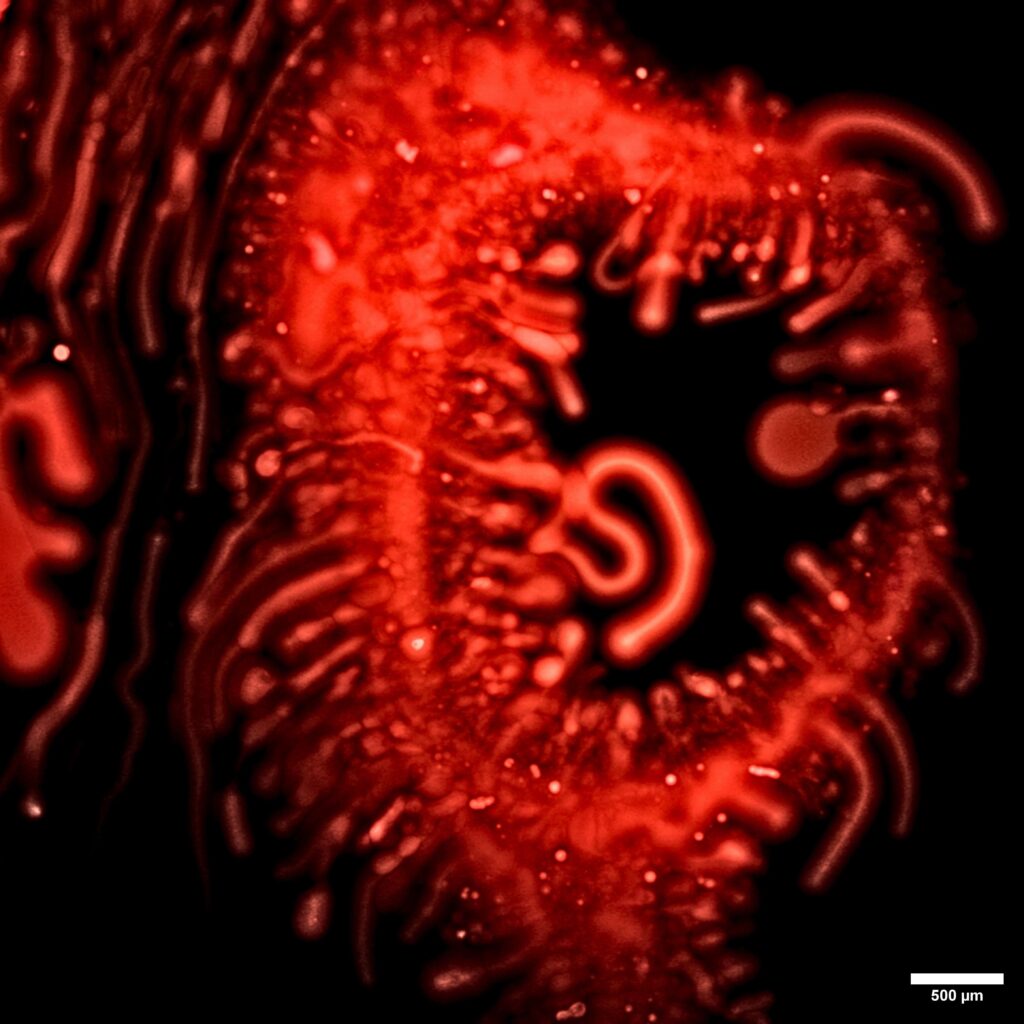 The Milky Way – Bacterial biomass of Serratia plymuthica PCM 550 growing on a nutrient agar plate. Photo taken on VHX-X1 digital microscope in reflected light with depth composition.